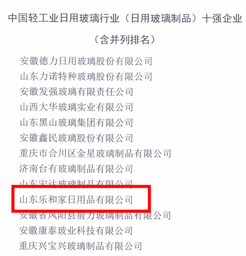 不忘初心 | 樂和家榮獲中國(guó)中國(guó)輕工業(yè)日用玻璃行業(yè) (日用玻璃制品) 十強(qiáng)企業(yè)